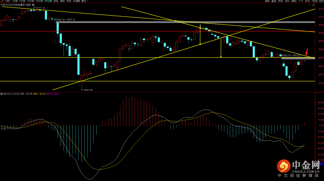沪深300即将打到六十分钟的下降趋势线,大概率在这位置附近会遇到压制,周二如果再次突破4842则会形成五分钟的双重背驰届时可能出现回落,关注4800附近的中枢下沿支撑。