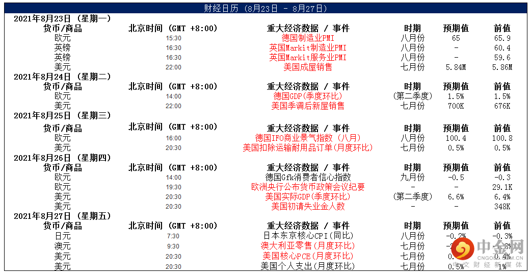 上周五,美元指数一定触及九个半月高位后下跌,因风险偏好改善,股市上涨,指标美债收益率走高。但美元近期前景依然乐观,在各国央行开始逆转刺激措施之际,人们担心Delta变种病毒可能会破坏全球经济复苏,这让美元总体上仍受到支撑。今日,美国将公布8月Markit制造业、服务业PMI初值,目前市场预计变化不大。整体来看,美元中线仍为偏强结构,短线或有技术性整理。
