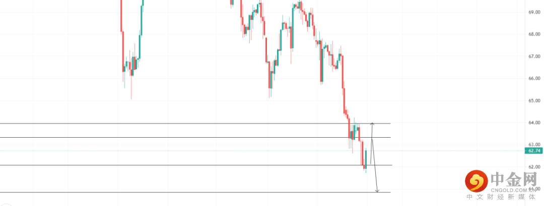 美元指数受支撑,原油下跌,关注62.07的4小时支撑位置,回调收多可看多至63.96,止损61.70;关注63.33压力位,4小时受阻收空即可看空至60.84,止损63.62
