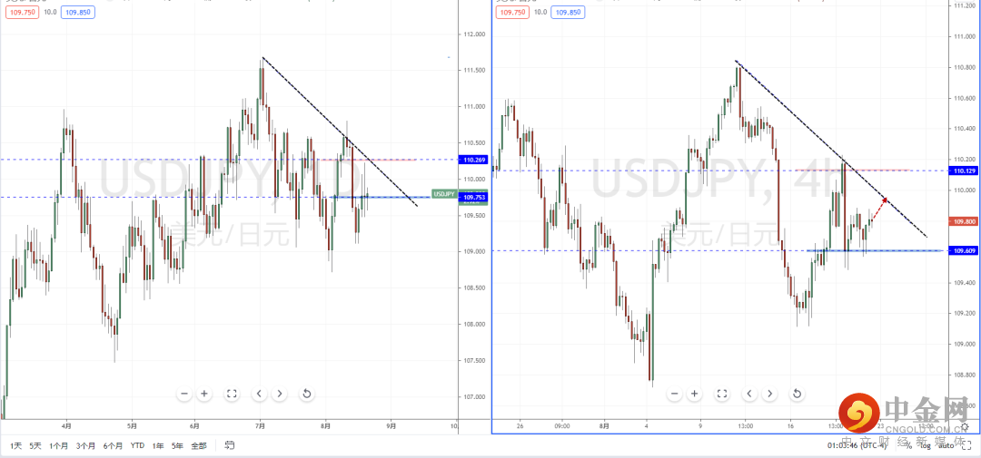 美日天图:目前行情在短期支撑带109.753附近起稳后继续向上反弹,但整体格局依然处于在空头阶段中,上方水平压制带在110.269附近。从日内4小时级别,可适当价格回测上方压制后再次走弱的空头机会,下方目标位置参考前期低点附近。