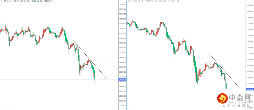 恒生指数天图:目前整体行情继续处于在空头阶段中,上方有下降趋势线的压制作用。但价格短期已经触及前期水平支撑带24854.23附近,从日内4小时级别,可适当关注价格回测上方压制后再次下行破位的空头机会,下方目标位置参考周线前期低点附近。
