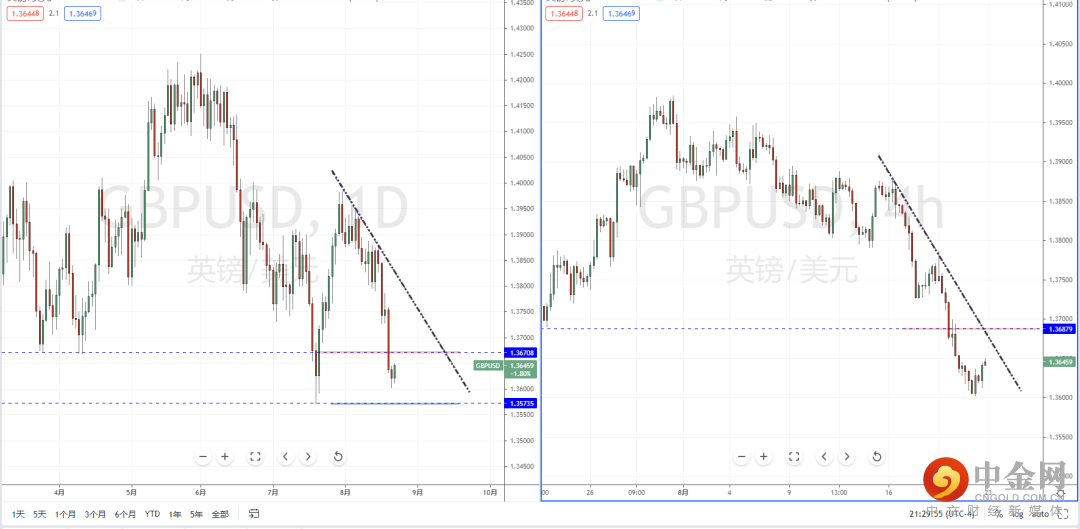 镑美天图:目前整体趋势虽然在空头阶段中,在近期趋势持续下行之后也即将测试下方水平支撑带1.35735附近,进入反弹阶段。从日内4小时级别,可适当关注价格调整后上行反弹的多头机会,上方目标位置参考1.36789附近。