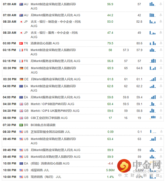 2021-08-19 11:01 PM GFK消费者信心指数 Aug -8,目前数据处于在弱势阶段,属于利空。2021-08-19 11:30 PM 日本 - 通货膨胀率Jul -0.3%,目前数据处于弱势,属于利空。2021-08-20 01:30 AM 中国 - 利率 3.85%,目前数据维持不变,属于利空。