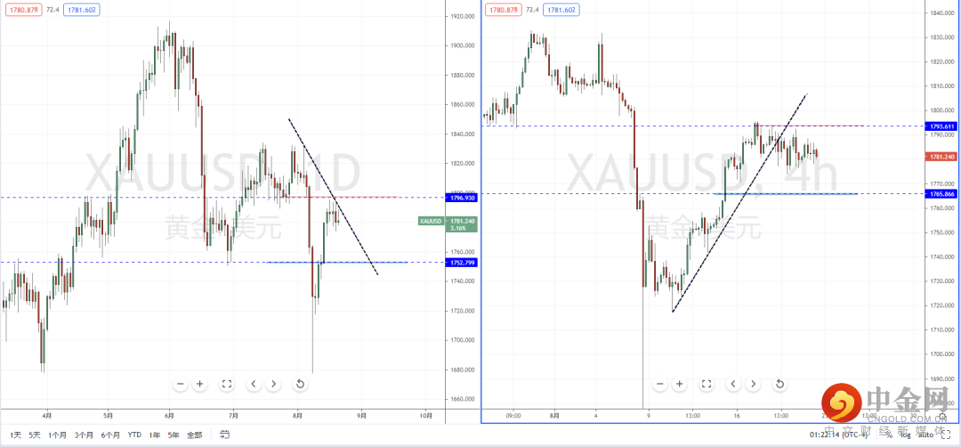 黄金天图:短期价格在回测上方多重压制区域1796.930附近再次受阻,同时又有下降趋势线的压制作用。整体格局处于在空头阶段中,从日内4小时级别,其趋势处于在窄幅区间阶段徘徊。可适当关注价格调整后继续破位下行的空头机会,下方目标位置参考1765.866附近。