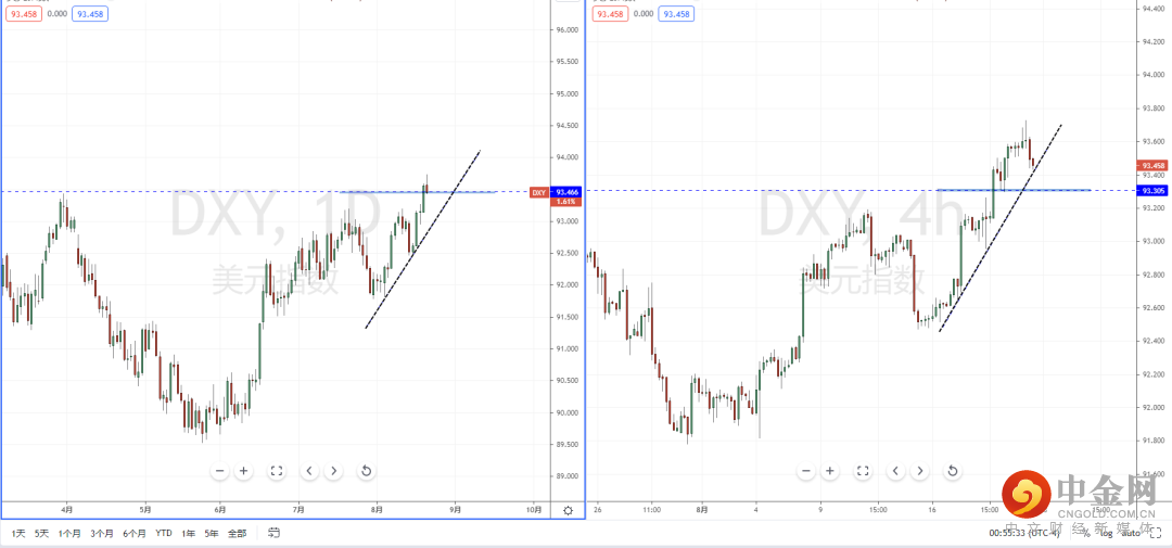 美元指数天图:目前整体行情继续保持多头格局,下方有上升趋势线的支撑作用。短期价格在冲击上方水平压制带93.466附近徘徊,从日内4小时级别,其趋势也正处于在回测调整中,可适当价格测试下方多重支撑后再次起稳上行机会,上方短期目标位置参考93.750一带。