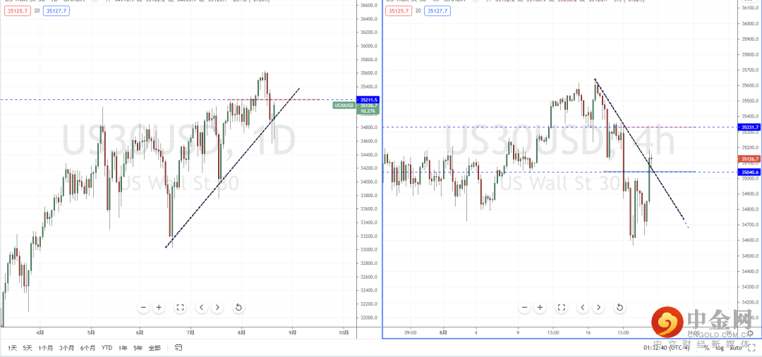 道琼斯指数:目前行情在极端测试下方上升趋势线后再次起稳上行,由于近期趋势反复性较大,不宜追多,并且上方水平压制带在35211.5附近。从日内4小时级别,价格短期有效突破压制,可适当关注价格调整后继续向上的多头机会,上方目标位置参考35349.1一带。
