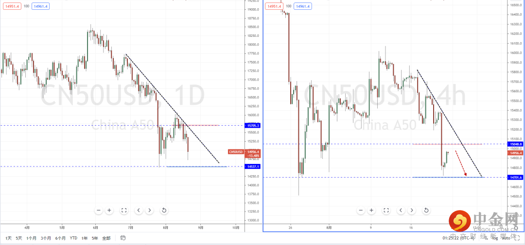 A50指数天图:目前趋势在回测上方压制后受阻继续下行,并且价格已经测试前期水平支撑带14537.1附近。从日内4小时级别,不宜追空行情。可适当关注价格回测上方压制带再次走弱的空头机会,目标位置参考前期低点附近。