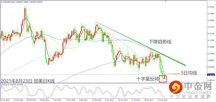 日级别线图,出现十字星反转,反弹冲不过下降趋势线,可能延续下跌走势。