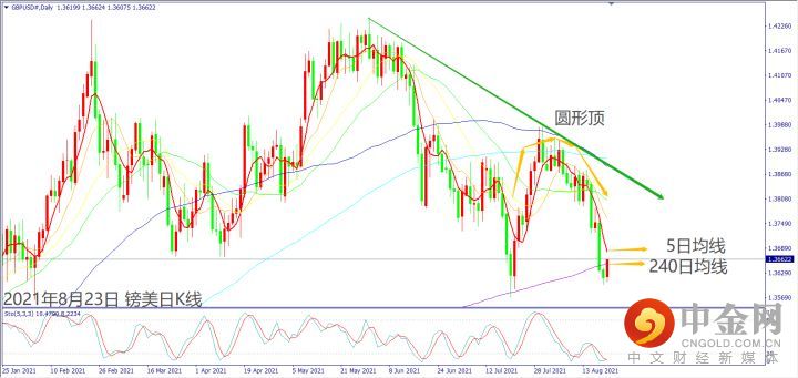 日级别线图,圆形顶反转延续空头,反弹突破240日均线,可能挑战5日均线。