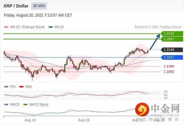 RSI 高于 50。MACD 为正且低于其信号线。该货币对可能会回撤。此外,价格高于其 20 和 50 周期移动平均线(分别位于 1.2148 和 1.1659)。
