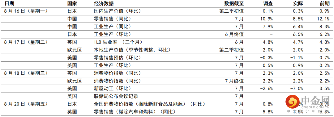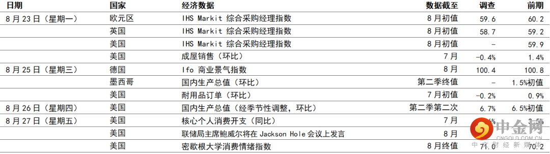 预期美国在周五公布的7月份核心个人消费开支平减指数的全年变化(联储局偏好的通胀指标)将升0.1个百分点至3.6%(同比)。长远而言,政策官员对一系列服务和商品价格增长的目标为2%(同比),但当局将容许通胀适度高于此目标「一段时间」。部分原因为弥补过去十年低于目标的数据,并确保通胀预期稳定向好。在近期公布的数据支持下,当局亦确定目前数据高企的主因是由受压抑的经济重启需求,或受供应链受阻所影响的类别引起。官员认为,这些因素应属暂时性,且会在未来数月逐渐减退,惟步伐将非常缓慢。同日,联储局主席鲍威尔将在堪萨斯联储Jackson Hole年度经济政策研讨会上就美国经济前景发言。
