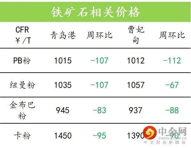 1、上周Platts 62%指数报收130.20美元/吨,周环比大幅回落30.65美元/吨。