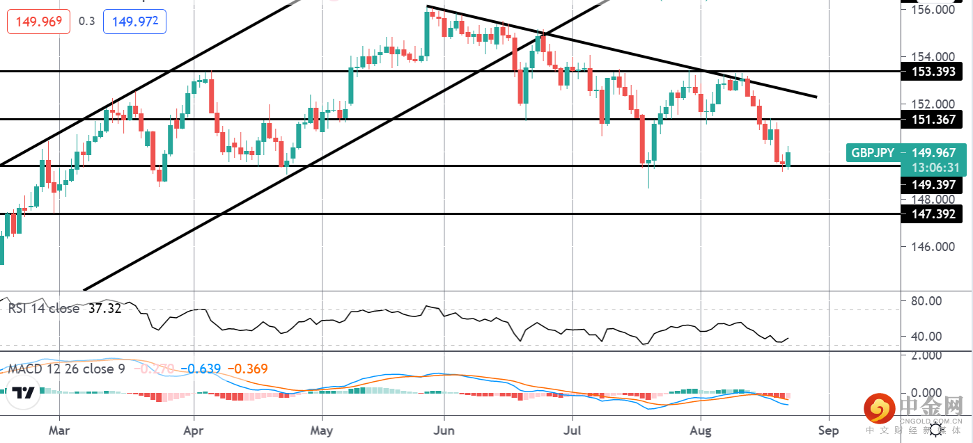 最近的英镑兑日元头肩式交易已经看到价格跌破目标 149.39。 MACD 和 RSI 均看跌,表明存在进一步下行空间。然而,目前的水平是英镑兑日元的主要支撑区域,目前价格走势仍在持续,表明需要耐心。空头可以在突破当前低点后重新设置空头,接下来目标是 147.39 水平。