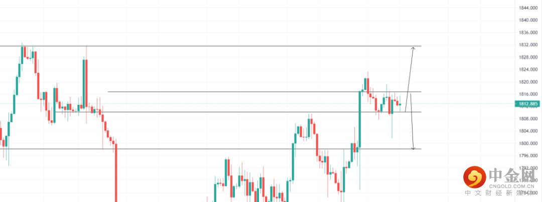 美元指数受承压,黄金下跌,关注1809.08的支撑位,4小时回调收多即可看多至压力位1831.53位置,止损1807.58;关注1816.73压力位,4小时受阻收空即可看空至1798.25,止损1819.50