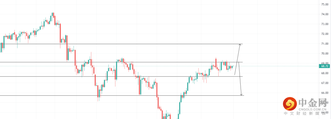 美元指数受承压,原油下跌,关注67.67的4小时支撑位置,回调收多可看多至70.97,止损67.29;关注69.11压力位,4小时受阻收空即可看空至67.67,止损69.39
