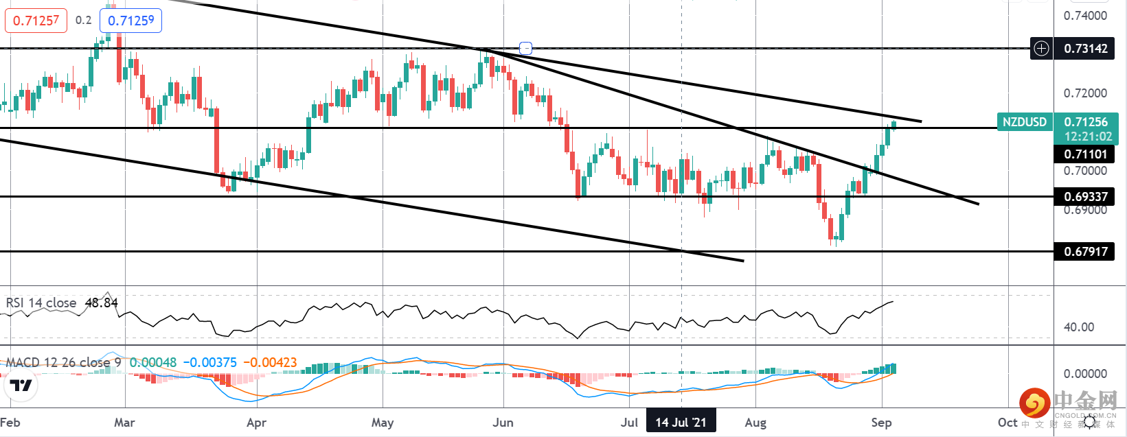 此外,新西兰央行是 G10 央行中最鹰派的央行之一。由于新西兰央行已于本月宣布结束量化宽松政策,并明确表示打算尽快加息,因此新西兰元拥有很大的上行前景,这应该会在未来几周内保持新西兰元兑美元的支撑,前提是没有在今天的数据的支持下,美元上涨烟花。所以这是基本背景,现在让我们看一下技术图。