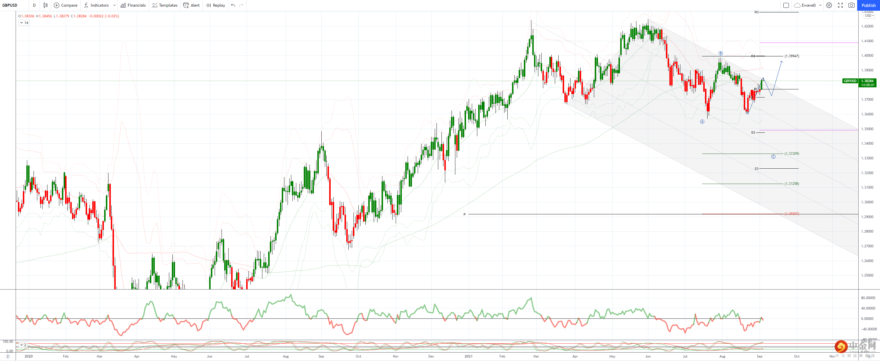 设置目标下降 1.3919 上 21 天布林带,如 7 月/8 月