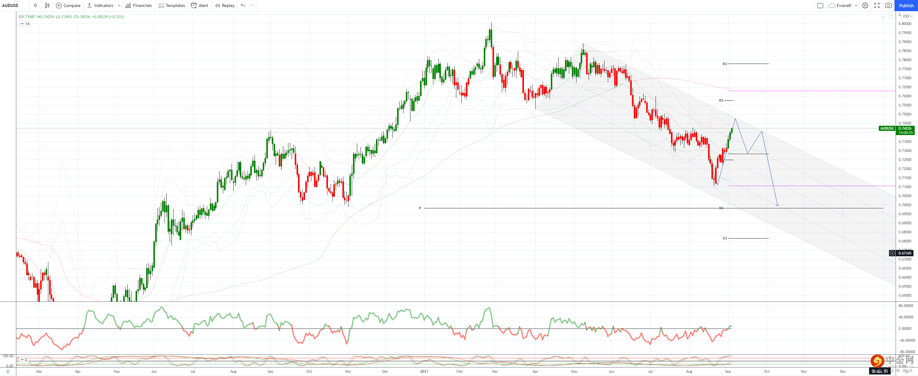 突破目标稳固 0.7450,38.2% 2021 年 2 月至 8 月下跌,21 天波利带上方