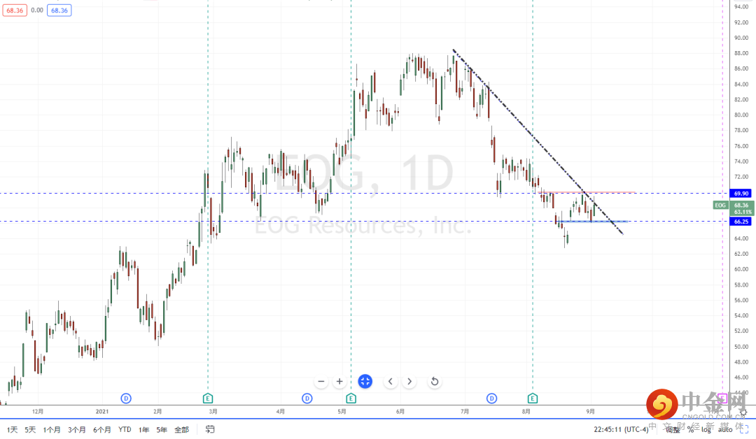 EOG:目前市场环境短期偏于利好,并且在能源类板块的冲击下,整体ETF能类产业转势上行。从EOG目前表现也受到止跌起稳,下方水平支撑带在66.25附近。虽然上方有下降趋势线的压制作用,但可适当关注价格调整后上行突破的多头机会,上方区间目标位置参考74.32附近。