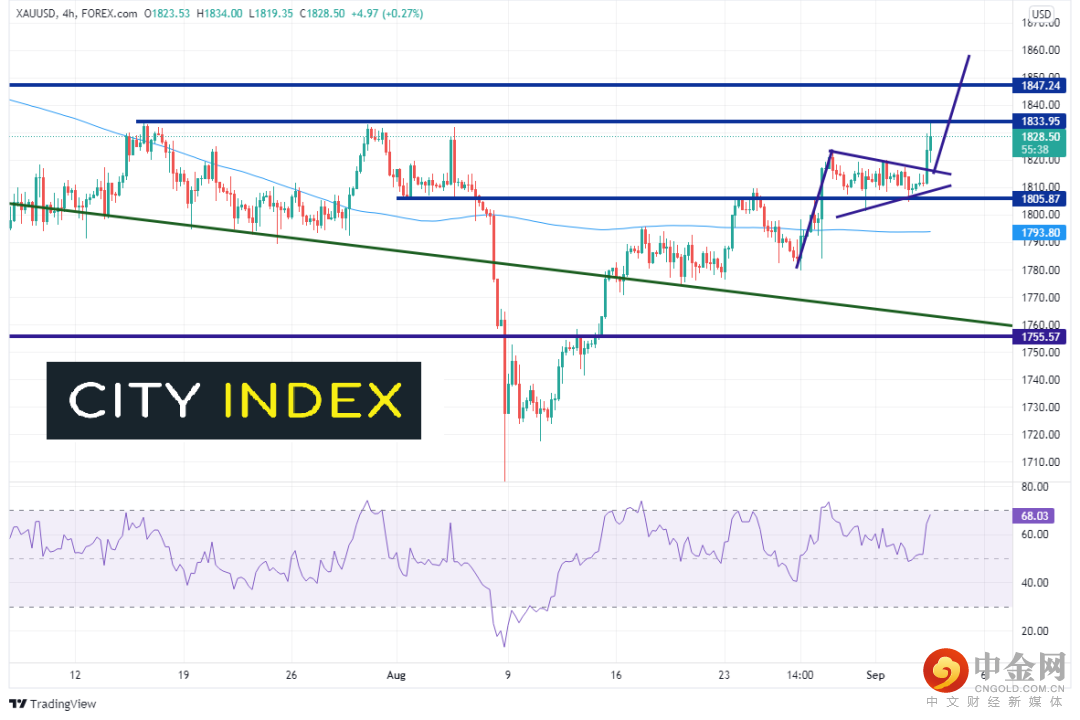 尽管非农疲弱利淡美元,却利好黄金 (XAU/USD)。240分钟图上,金价在数据发布后升穿三角旗高点。旗形目标位在1857附近,但价格必须先拿下强劲水平阻力1834,然后再上穿1847.25。支撑位在1818附近旗形顶部趋势线,然后是1805附近底部趋势线和水平支撑位。