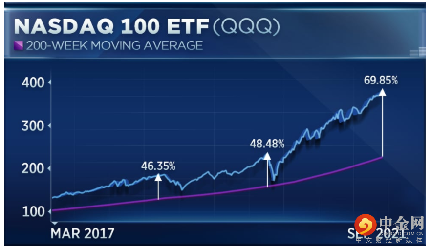 他表示,以以科技股为主的纳斯达克(15363.5159, 32.34, 0.21%)100指数为例。QQQ纳斯达克100 ETF目前较其200周移动均线溢价70%,远高于最近几次回调前的水平。