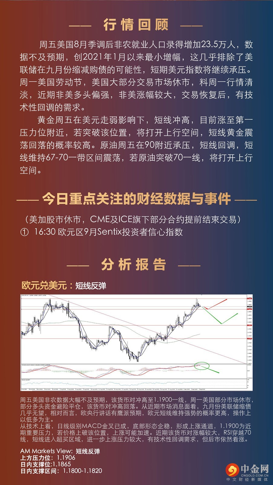周五美国8月季调后非农就业人口录得增加23.5万人,数据不及预期,创2021年1月以来最小增幅,这几乎排除了美联储在九月份缩减购债的可能性,短期美元指数将继续承压。周一美国劳动节,美国大部分交易市场休市,料周一行情清淡,近期非美多头偏强,非美涨幅较大,交易恢复后,有技术性回调的需求。 黄金周五在美元走弱影响下,短线冲高,目前涨至第一压力位附近,若突破该位置,将打开上行空间,短线黄金震荡回落的概率较高。原油周五在90附近承压,短线回调,短线维持67-70一带区间震荡,若原油突破70一线,将打开上行空间。