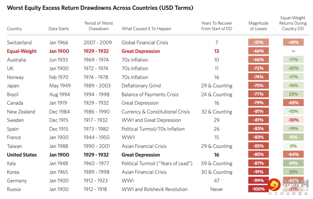 回顾上个世纪的历史,地缘政治动荡、战争、债务危机、货币改革或资产泡沫破裂等灾难性事件彻底摧毁了投资者的财富,而其他国家的市场仍然保持弹性。