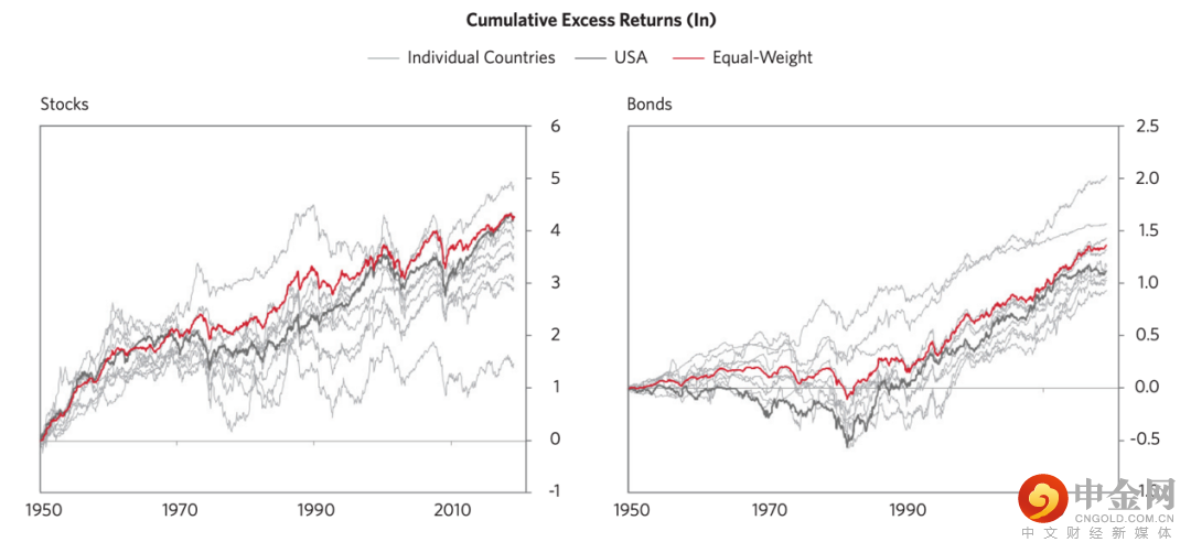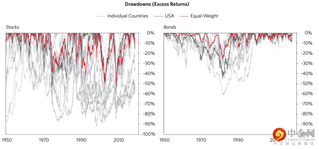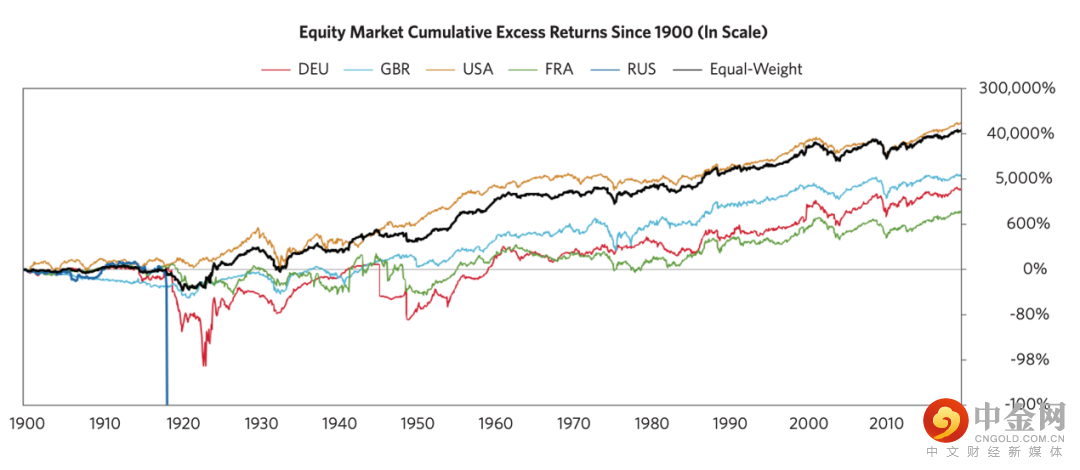 为了进一步说明地域多元化的重要性,上图显示了从1900 年至今的累计股票回报高于现金。在1910-1920 年代左右,集中在俄罗斯股票市场(RUS— 深蓝色)或德国股票市场(DEU— 红色)的投资者将被彻底消灭。