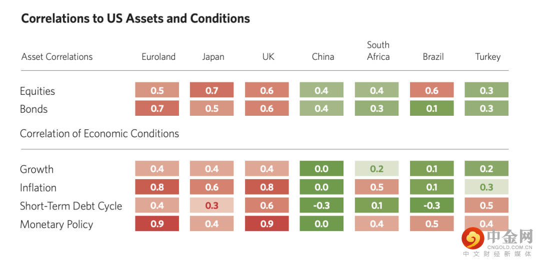 与此同时,国与国之间发生冲突的风险不断增加,这增加了出现分歧结果的可能性。所有这些力量都提高了未来多元化的重要性。下表显示了与美国相比,新兴国家经济及其市场的相关性。
