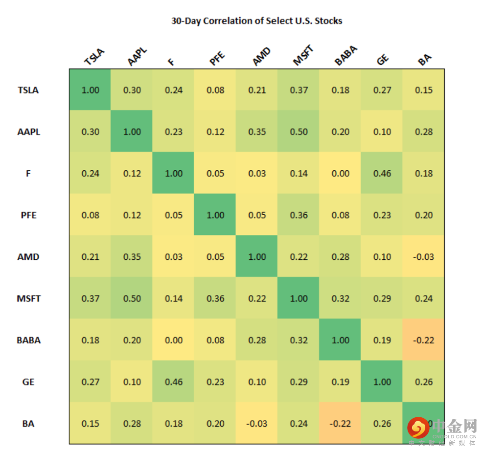 在下面的示例矩阵中,我们可以看到微软(MSFT)和苹果(AAPL)的相关性强于美国超微半导体(AMD)和辉瑞(PFE),或波音(BA)和阿里巴巴(BABA)。