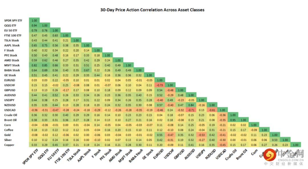 提醒:相关性为1 表示资产价格完全相关,度量值为0 表示根本没有相关性,负相关性为-1 表示价格向相反方向移动。
