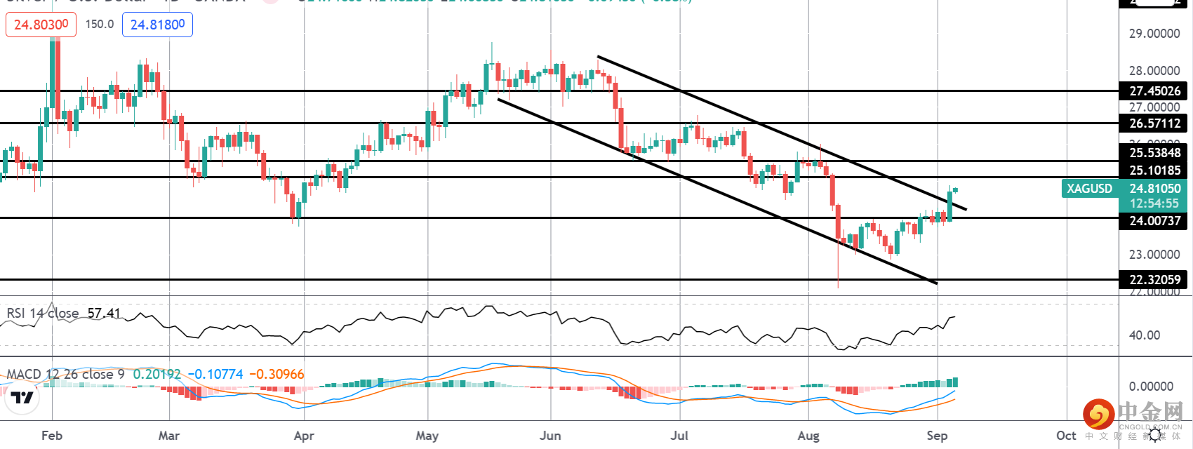 白银价格在上周跟随金价走高,市场现在终于开始突破自 8 月中旬以来形成价格走势的盘整基础。由于美元走软和股票价格上涨,白银的近期前景仍然乐观,但与黄金一样,本周美国数据有可能造成波动。