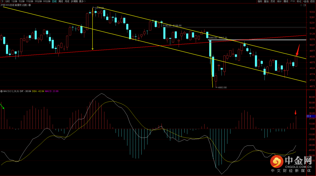 沪深300出现尝试突破下降趋势上轨道,短期注意是否能够连续三日站稳下降趋势轨道,如果出现站稳则有望去回补前期5080附近的缺口,而短期由于五分钟的顶背离结构,有可能在这个位置会有一笔回踩确认,关注4887到4900区间支撑。