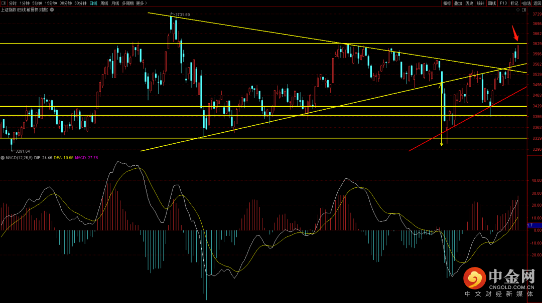 大盘短期出现再次上扬,目前离前期高点只差3个点,后续行情关注这个位置是否出现突破,一旦突破大概率就会在短期去挑战前期3731的高点。而未来两周关注是否站稳周线下降趋势线,一旦站稳后续高点大概率会出现在3833,而短期五分钟已经出现顶背驰结构,而十五分钟与三十分钟有顶背驰结构的预期,一旦出现短期有望出现回落,而下方支撑关注3600,如果跌破则有可能回踩前期下降趋势线3540到3560这个区间。注意把控好节奏点。