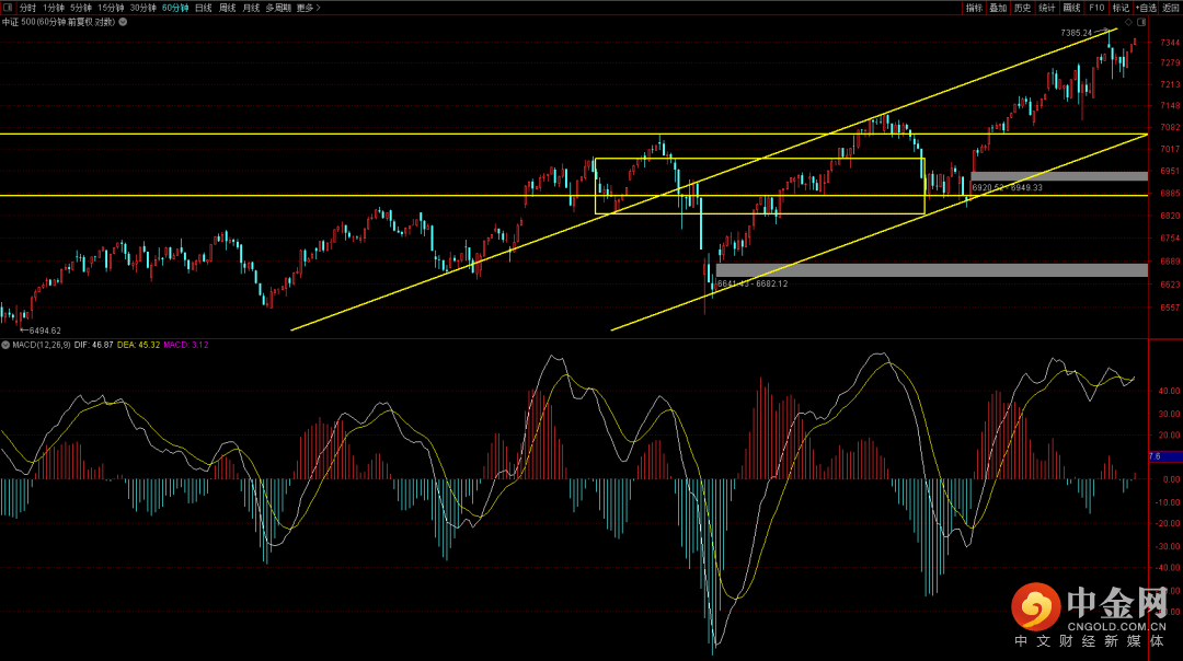 中证500继续维持强势上行,短期继续观察六十分钟的的上升趋势线,由于短期结构的复杂性,在不破通道趋势之前可以继续维持向上的走势,只有跌破了通道趋势且出现日线macd量柱连续的收敛才能够确立调整走势。
