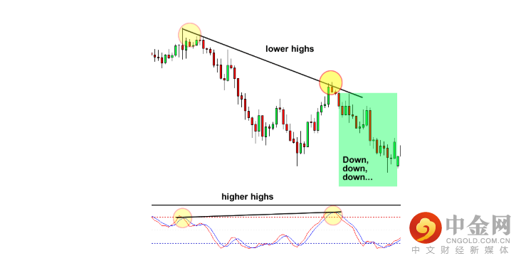 在上图中,该货币对显示出较低的高点,而随机指标已经创出更高的高点。现在这是一个看跌背离,它肯定很容易立即做空。