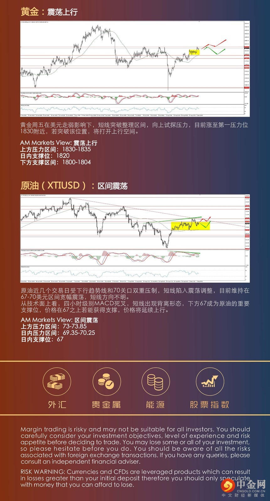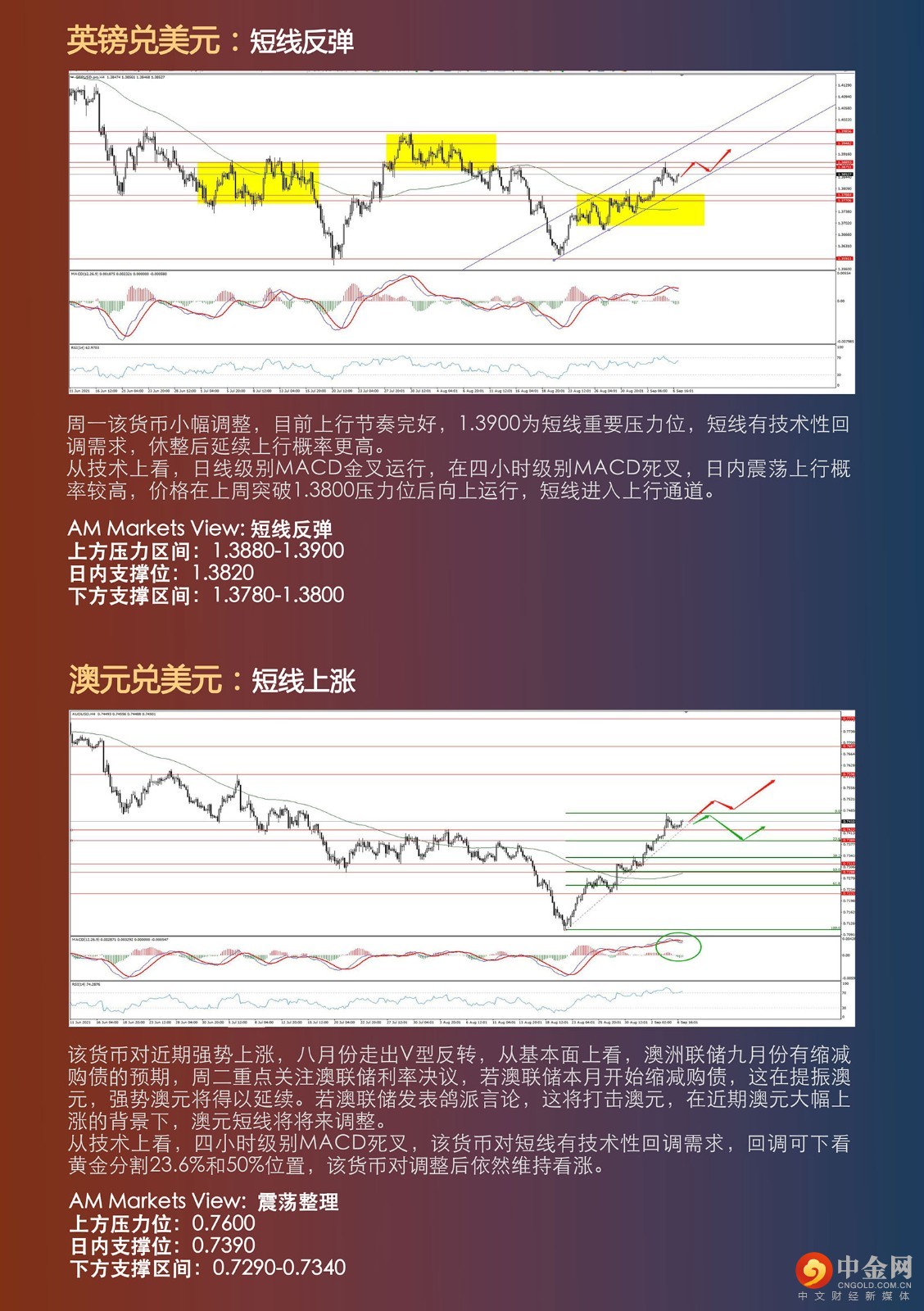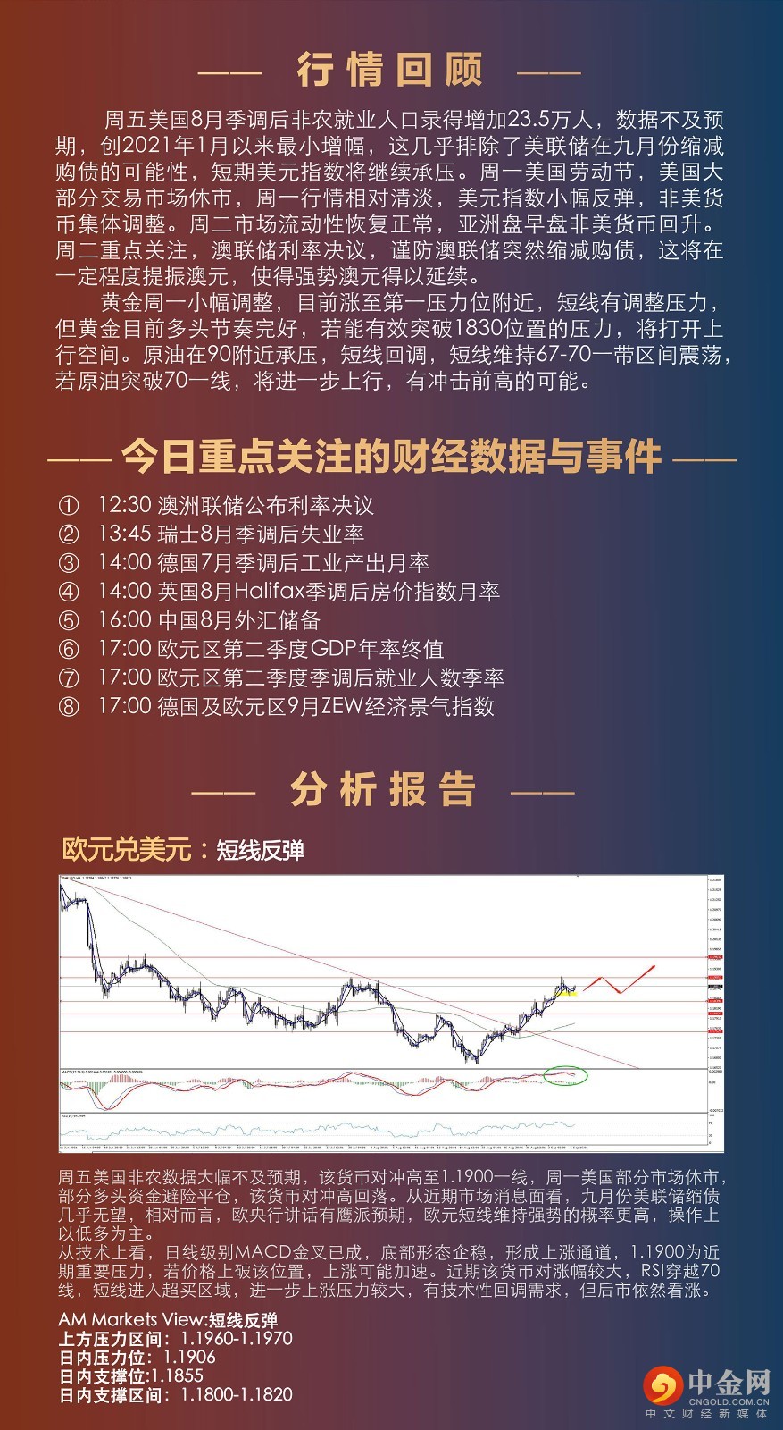 周五美国8月季调后非农就业人口录得增加23.5万人,数据不及预期,创2021年1月以来最小增幅,这几乎排除了美联储在九月份缩减购债的可能性,短期美元指数将继续承压。周一美国劳动节,美国大部分交易市场休市,周一行情相对清淡,美元指数小幅反弹,非美货币集体调整。周二市场流动性恢复正常,亚洲盘早盘非美货币回升。周二重点关注,澳联储利率决议,谨防澳联储突然缩减购债,这将在一定程度提振澳元,使得强势澳元得以延续。 黄金周一小幅调整,目前涨至第一压力位附近,短线有调整压力,但黄金目前多多头节奏完好,若能有效突破1830位置的压力,将打开上行空间。原油在90附近承压,短线回调,短线维持67-70一带区间震荡,若原油突破70一线,将进一步上行,有冲击前高的可能。