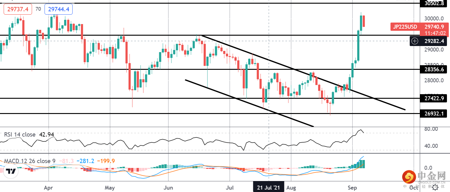 上周日经指数突出显示的通道突破使市场远高于发布的 29464.9 目标。由于美国劳工报告淡化了美联储近期缩减规模的任何可能性,以及日本首相候选人伏田呼吁推出新的大规模经济刺激计划,日经指数在短期内有足够的空间上涨。自上午的PM Suga宣布他不会竞选以来,佛陀的选举机会增加了。在美国劳工报告的支持下,风险资产可能会继续受到支撑,短期前景仍然有利于日经指数,而 29464.9 将成为支撑。在此上方,多头可以将 30502.8 作为下一个目标。