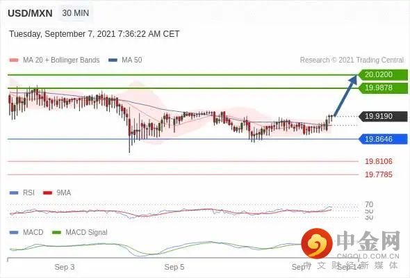 RSI 高于其中性区域 50。MACD 为正且高于信号线。配置是积极的。此外,价格高于其 20 和 50 周期移动平均线(分别位于 19.8975 和 19.8978)。最后,美元/墨西哥比索已突破其上布林带(19.9187)。