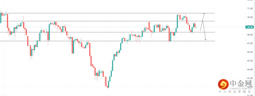 美元指数受承压,原油下跌,关注68.29的4小时支撑位置,回调收多可看多至70.48,止损67.82;关注69.56 压力位,4小时受阻收空即可看空至67.27,止损70.14