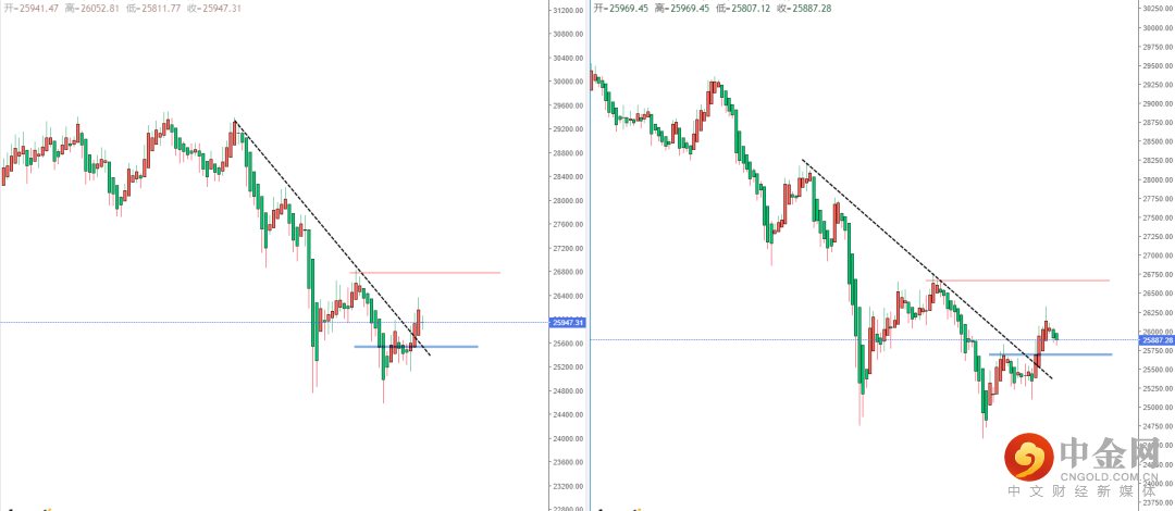恒生指数天图:目前趋势转势多已经成立,价格在突破下降趋势线后继续上行,下方水平支撑带在25744.82附近。从日内4小时级别,价格在小幅调整后继续上行,上方目标位置可适当参考26716.26附近。