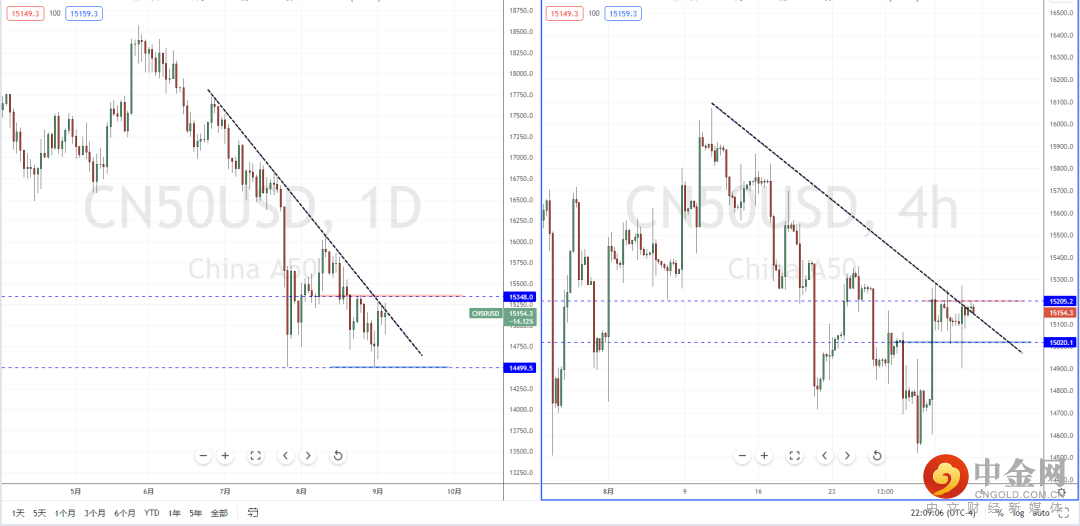 A50指数天图:目前行情筑底成立,短期价格有效突破下降趋势线的压制作用,以及水平压制带15348.0附近。由于趋势处于在转势初期,则需要进一步确认。从日内4小时级别,可适当关注价格有效回测支撑区域后再次起稳上行的多头机会,上方15809.5一带。