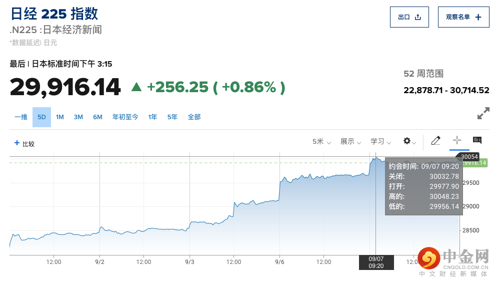 2021年9月3日(周五),去年9月因安倍晋三辞任而接任的日本首相菅义伟突然宣布不参加9月举行的执政党自民党总裁的选举,这意味着日本将在9月迎来新首相,消息公布之后,日经225指数跳涨2%,而在周一,日经225指数继续上涨,上涨1.83%,收于29659.89,而在周二,日经225指数继续上涨,在早盘时间突破30000点,这是自4月以来首次触及。