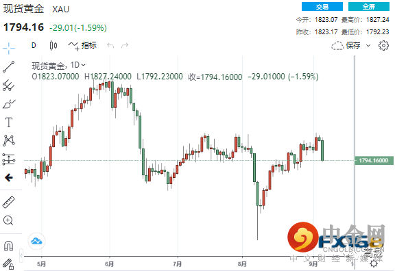 美市尾盘,现货黄金收报1794.16美元/盎司,大跌29.01美元或1.59%,创下自8月9日以来最糟糕的一天,日内最低触及1792.23美元/盎司,较日高1827.24美元/盎司大幅回落35美元。
