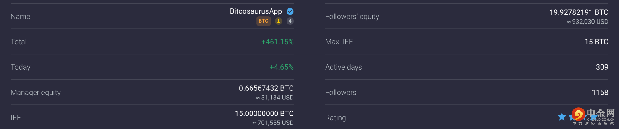 但是,请密切关注一位经过验证的策略经理 BitcosaurusApp。 这个用户可能排在第 7 位,所以它似乎没有第一或第二位那么耀眼,但是,这是一个四星级和通常五星级的交易者,他们的表现缓慢而稳定。
