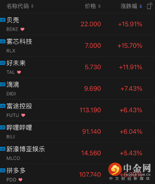 此外,滴滴涨7.43%,好未来涨11.91%,贝壳涨15.91%,雾芯科技涨15.70%。