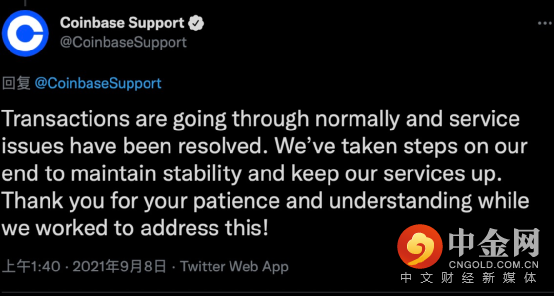 Coinbase Support也发推文称,已经注意到出现了交易延迟或被取消,应用程序可能会出现错误,Coinbase团队正在调查此问题。