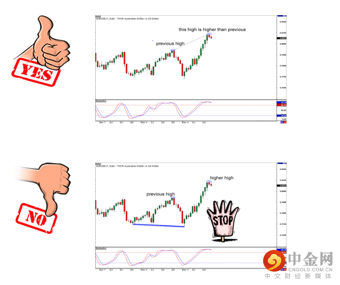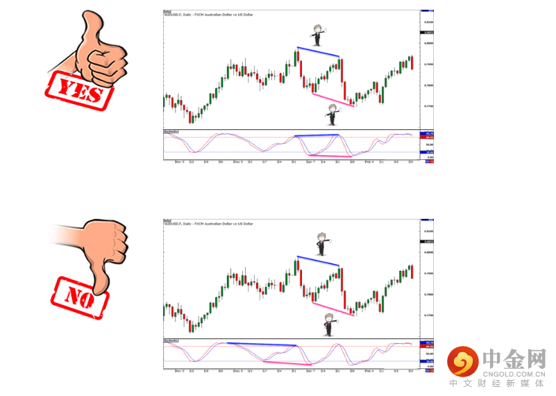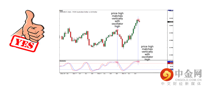 您在指标上确定的高点或低点必须与价格高点或低点垂直排列。
