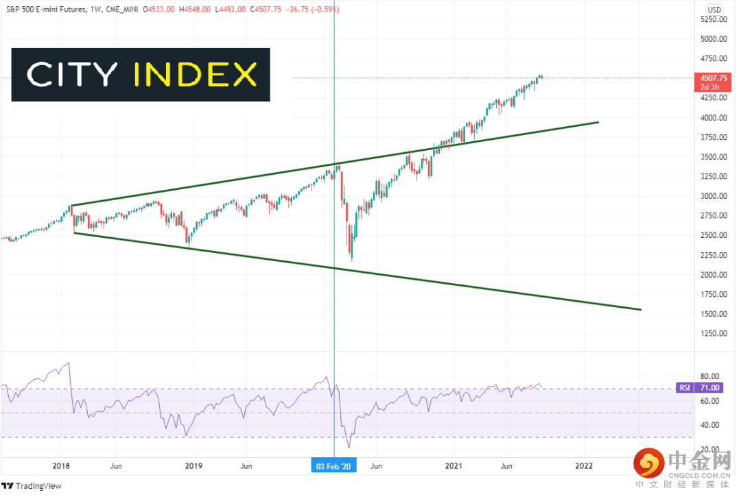 2018年1月,标普500指数在短期内自2878.5暴力下跌至2529,跌幅12%。当时谁能想到这350点的下跌行情开启了喇叭形态,该大盘股指在接下来的34个月内都交投于内?但是,在疫情袭击全球各国投资者手握大量现金寻找出口的背景下,标普500指数于2020年3月23日构筑2174低点后当周收高逾10%,最终在2020年11月23日当周向上突破喇叭形态的上轨。