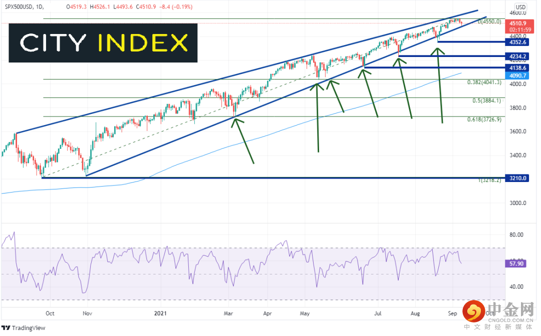 日图上从目前价位到100%回档位之间筑有无数的支撑位,而在楔形趋势线下破后就有诸多水平支撑位,分别落在4352.6、4234.2和4138.6。不要忘了,每次价格下破上升楔形趋势线,多头就逢低买入。200天移动均线就落在下方不远处的4090.7,接着是2020年9月低点到2021年9月3日高点行情的38.2%回档位,即4041.0附近。